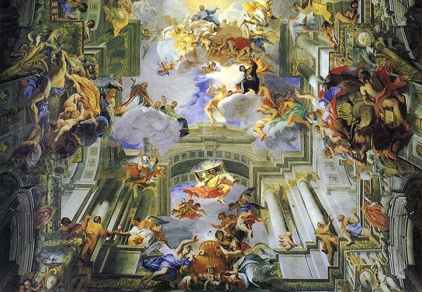 合。也吸收了文学、戏剧、音乐等领域里的一些因素和想象,大多数巴洛克的艺术家有远离生活和时代的倾向,在一些天顶画中,人的形象变得微不足道。