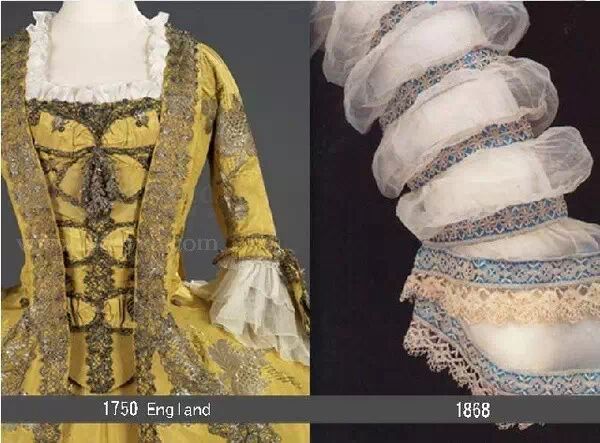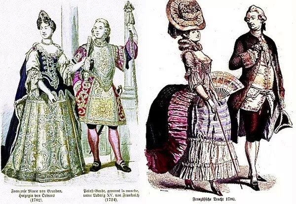 巴洛克时期的服装除了西班牙其他女人这个时候开始不用穿裙撑,裙子常常要有三层套,上衣要么齐脖子的花边大领,要么袒胸露乳,法国时期开始把领口挖深加宽,袖子镶着大量蕾丝,有時候袖子被打成很多段,一节一节的,每段都镶嵌蕾丝。