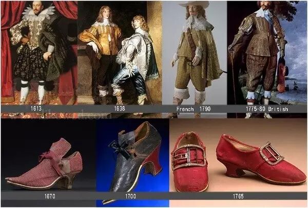 历史上最华丽最妩媚的男装在巴洛克時期。 最大的特点是大袖子蕾丝、带马刺的靴子、羽毛大帽子和佩剑。这个时候流行短小马甲,有点像西装背心。这个时候的內衣非常华丽,被大量丝带重重捆扎,一件內衣需要100多米長的缎带装饰。长外套开始出现,一开始没有领子,后来出现大领,从上到下密密麻麻装饰华丽的排扣,此時褲子流行燈籠褲,也是到膝蓋扣住,下面是緊身長襪。鞋子一般是方頭,鞋跟很高,一般是红色,鞋上装饰花朵或是緞帶,巴洛克晚期出现鞋扣以代替装饰。