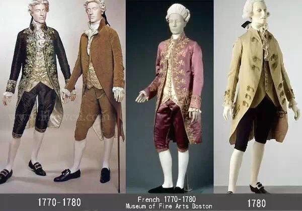 是现代西装的原型,男性外套逐渐变成直线条,常伴随前短后长的设计。同时也出现了领子的设计,袖子也有原来的大开口变成了贴合手臂的款式.1715年以后,裤子多用亮色, 1760年,男上衣开始去掉多余的修饰,缓解紧束的腰身,这种上衣称作夫拉克这是燕尾服的原型,也是现在的晨礼服的始祖,用料仍是丝绸,常有印花或条纹图案。